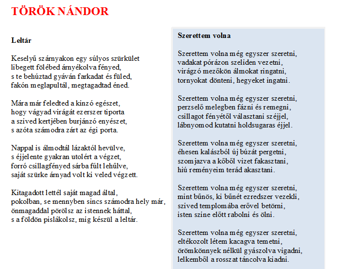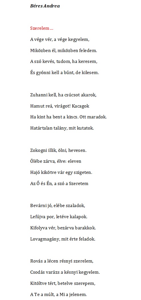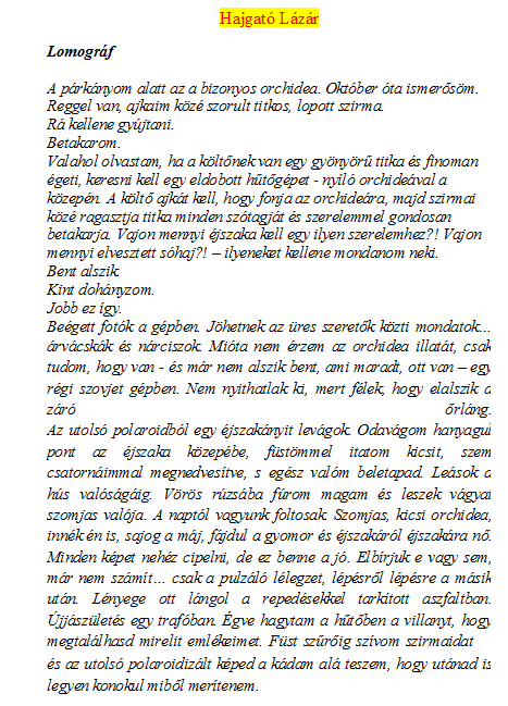 - Örökké felfoghatatlan... itt ül és cigarettával kínál. Átsétálok az ő fény-alagútjába. Az egykori szeretők által pásztorivá tett iszonyú üres, lágy részekre. Hónom alatt a szerelem. Rágyújtunk. Elszív. A pesti hóban sem felejtettelek. Suttogom. Magamnak. Obszcén neveket. Rám ragadnak, lepisszegett fátylak lágy méz- hatalmával. Körém fon. Tanknyi árjára célzom vele. Vágyai lövész árkában robbanok. Minden töltetem mosogatója alatt- szépen terítéken, karácsonyi díszként testére aggatva. Isten kudarcai közt ma éjjel a legszebb bűne lehetek.